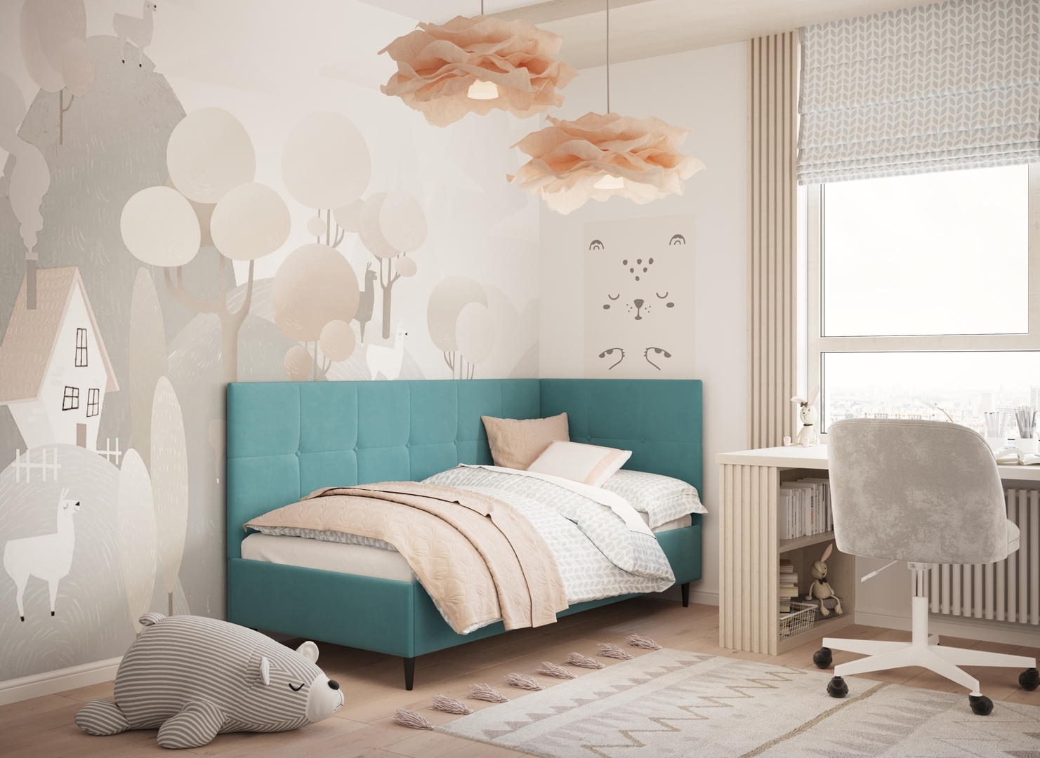 Угловая односпальная кровать MOON FAMILY 1261 с мягкой спинкой и изголовьем создаст в Вашей спальне ощущение уюта. Крупная квадратная стежка привносит в интерьер графических акцентов, а вставка из пуговиц наполняет пространство ощущением домашнего тепла.