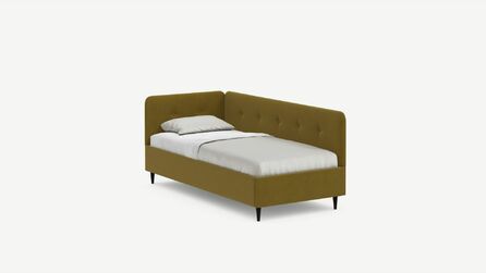 Угловая односпальная кровать MOON FAMILY 1253 с мягкой спинкой и изголовьем обладает округлыми формами, привносящими в интерьер нотки нежности. Изголовье, украшенное пуговицами, добавляет окружающему пространству шарм и уют. Высокие опоры придают кровати визуальной легкости, а также обеспечивают удобство во время уборки.
